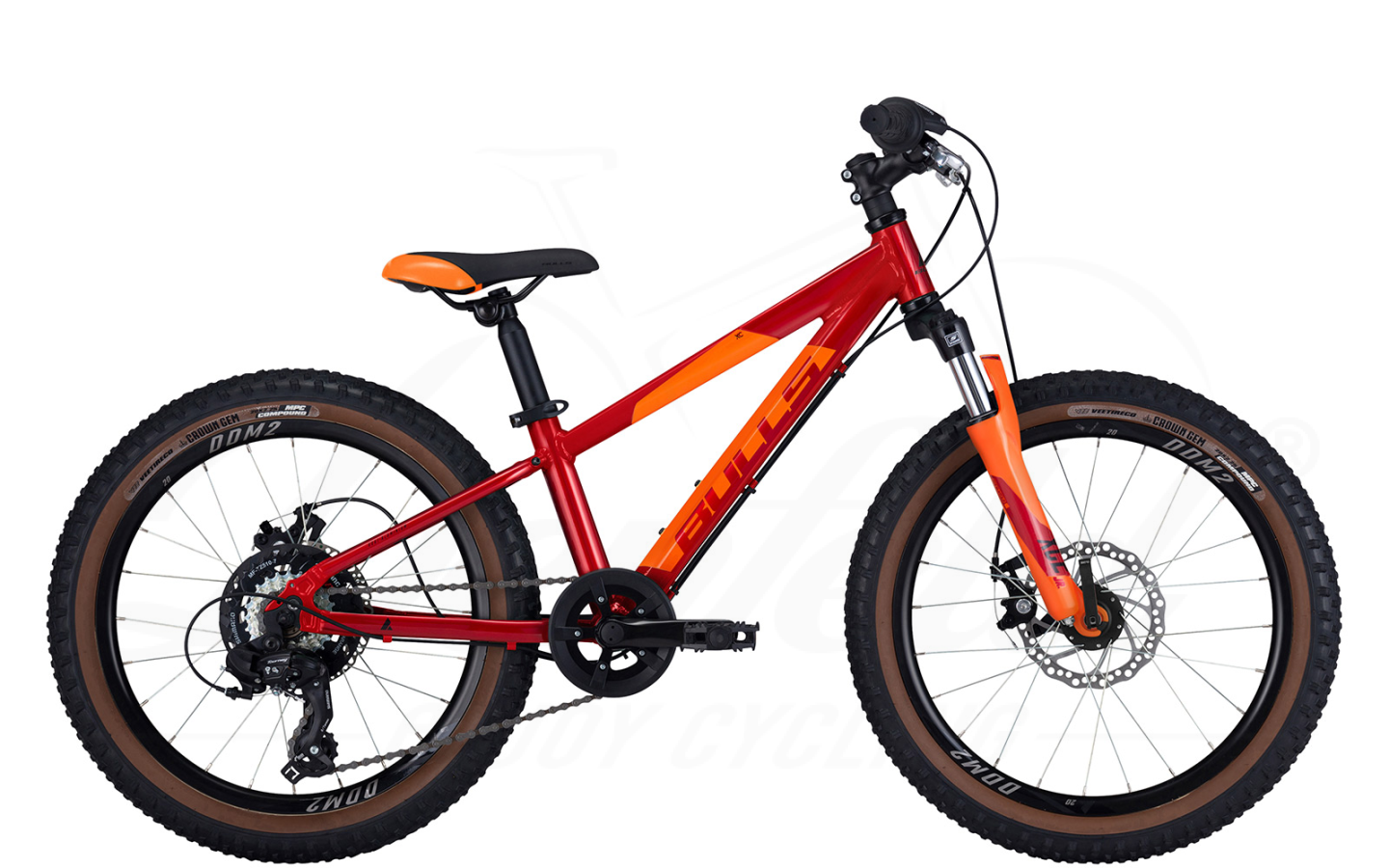 Der Aluminium-Rahmen in sportlicher Rahmenform ist besonders hübsch in einem knalligen Rot-Ton mit farblichen Akzenten. Federgabel an der Front, 20 Zoll Laufräder. Coole, griffige MTB-Reifen dürfen hier nicht fehlen.