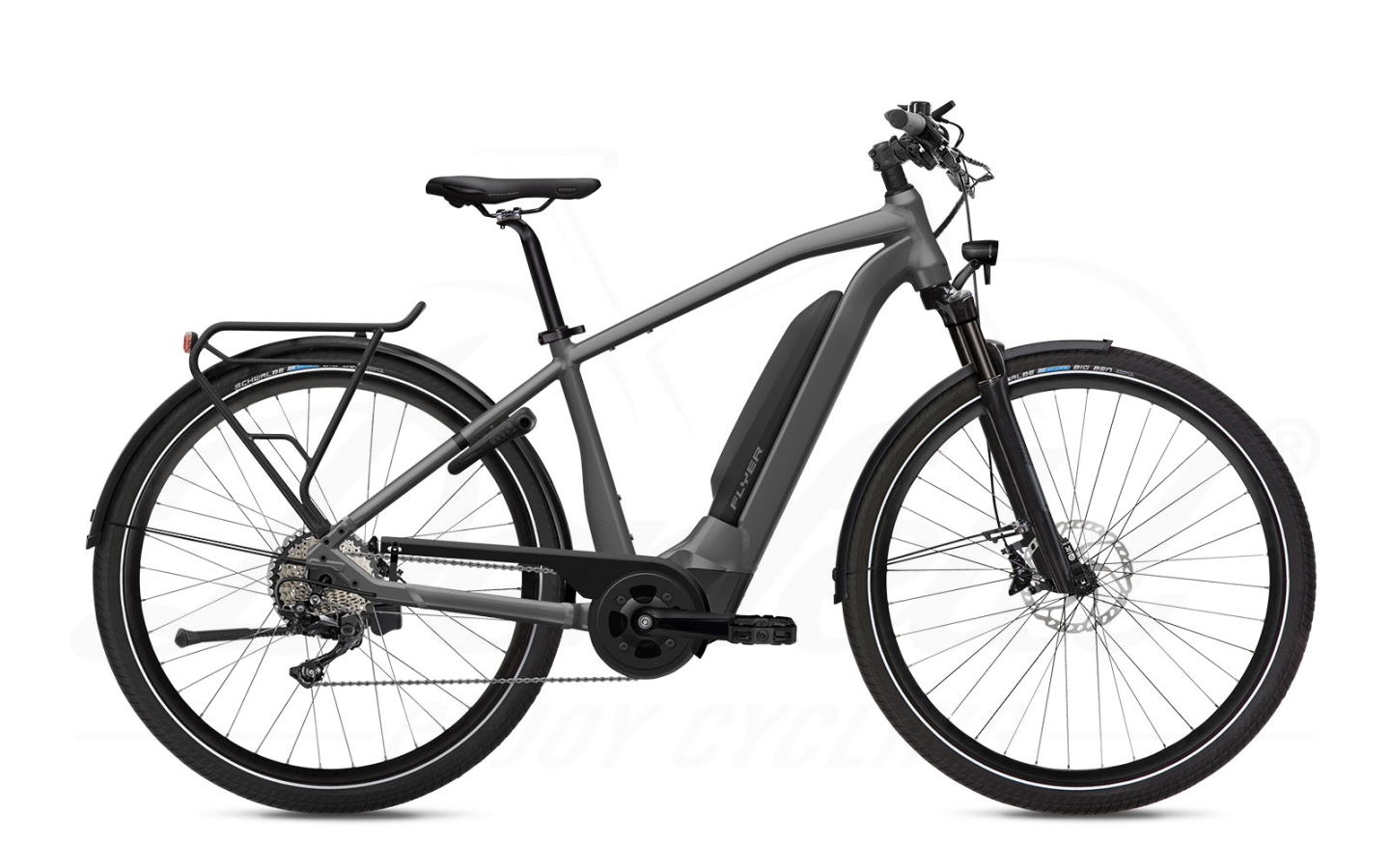 Die Upstreet-Modelle gibt es in der Wave-, Trapez- und Diamant-Rahmenform. Hier in der Modellvariante kommt das Flyer Upstreet5 mit Trapezrahmen in Anthracite Gloss. Das diagonal verlaufende Oberrohr macht Ihnen den Einstieg etwas einfacher.